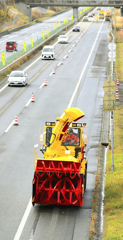 On Nov. 17, the prototype of a self-driving snow removal vehicle about 8 meters long and 2 meters wide made an experimental demonstration run on the Do-o Expressway in Iwamizawa, Hokkaido. Operator Minoru Matsuda, 40, said, "Even when visibility becomes very low in drifting snow, work can be done safely if this automation is realized."