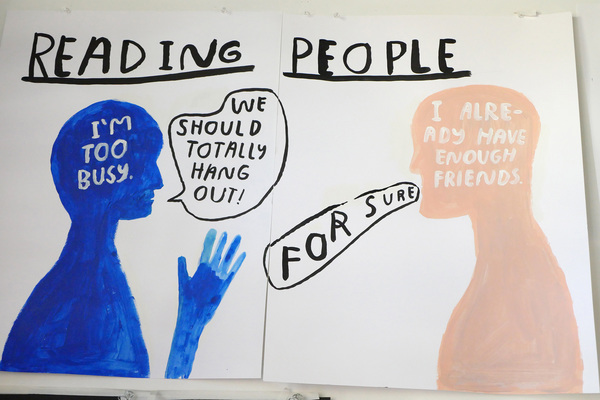 In one piece titled "Reading People," two silhouettes _ one blue and another pink _ are conversing. "We should totally hang out!" the blue person said. "For sure," the pink person replied. But the thoughts in their heads reveal that one is too busy while the other already has enough friends.