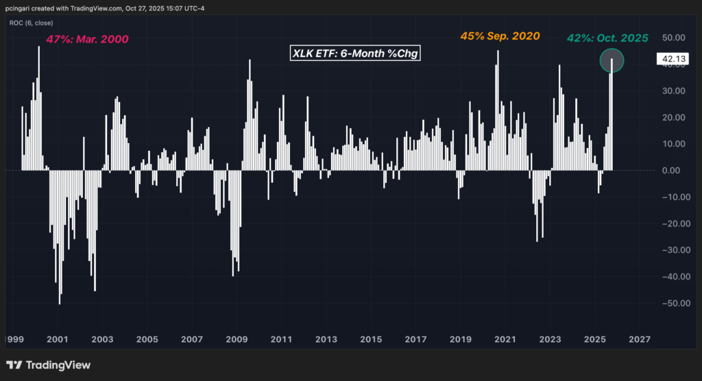 Since bottoming out in April amid tariff fears, the fund has gained more than 70%. If it climbs just 2.5% more this week, it will mark the biggest six-month rally since March 2000—weeks before the tech bubble burst.