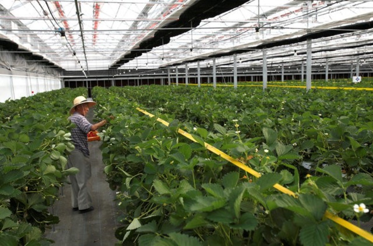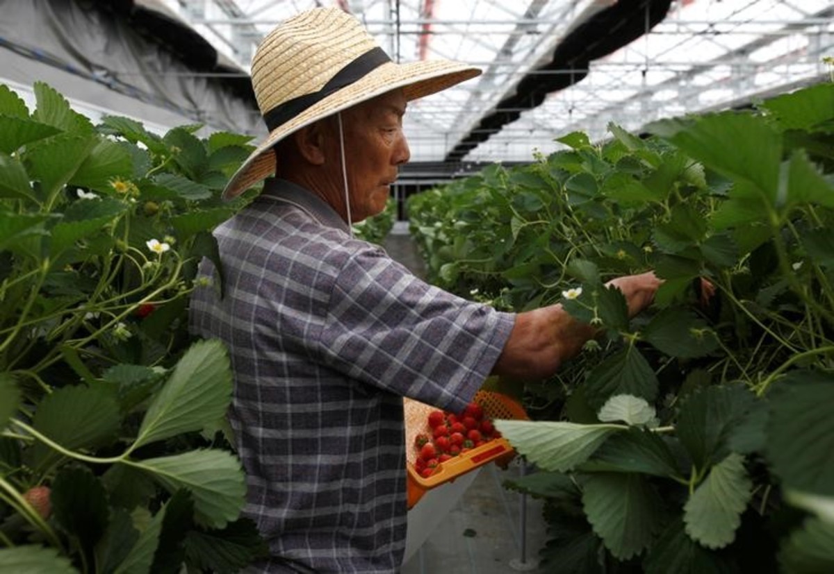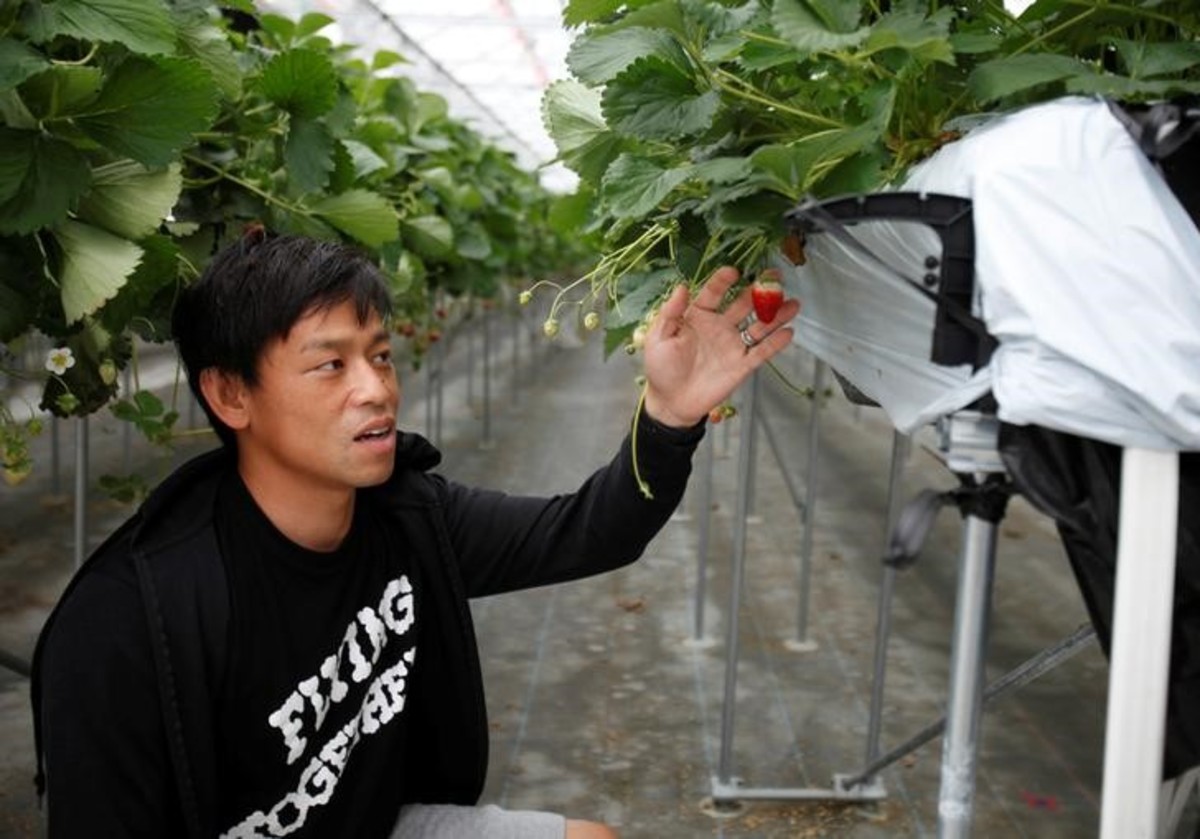 Hiroki Iwasa, a 40-year-old IT entrepreneur with an MBA, grows strawberries in seven high-tech greenhouses where computers set the temperature and humidity to optimum growing conditions and ensure the rows of bushes are sprayed with water at precise times.