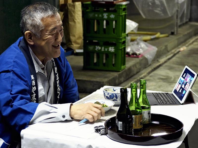 Three friends were seen on the device from their homes in Tokyo, and they participated in the event through an online network. As they listened to Sato's comments, they compared three different types of the brewery's local sake, which had been delivered in advance.