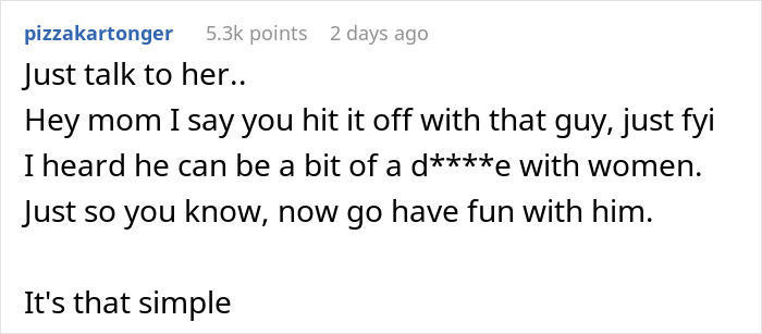 But even with all the sensitivities, it feels like the son should find an empathetic and non-confrontational way to simply inform his mom about her new admirer.