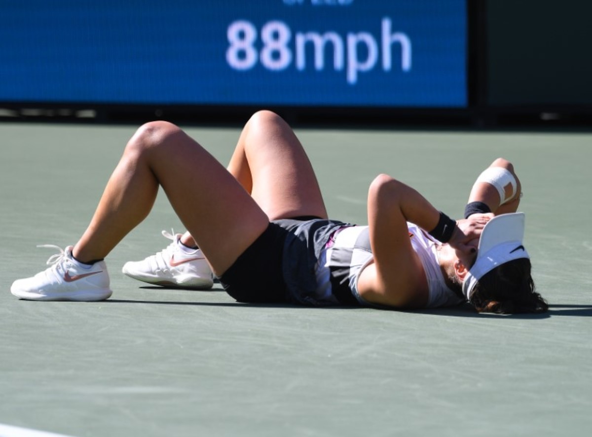 Mar 17, 2019; Indian Wells, CA, USA; Bianca Andreescu (CAN) reacts at match point as she defeats Angelique Kerber (not pictured) in the final match of the BNP Paribas Open at the Indian Wells Tennis Garden. Mandatory Credit: Jayne Kamin-Oncea-USA TODAY Sports