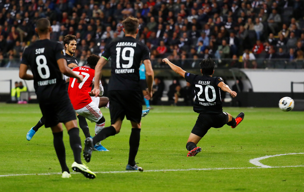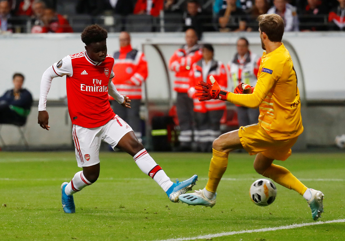 STOCKHOLM (Reuters) - Arsenal teenager Bukayo Saka scored his first goal for the club as they beat 10-man Eintracht Frankfurt 3-0, while Manchester United's 17-year-old Mason Greenwood secured a 1-0 win over FC Astana as the Europa League group stage began on Thursday.