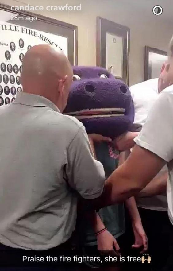 But finally, after a sweltering 45 minutes trapped inside, the firefighters snipped several small cuts at the base of Barney’s head. Darby was free.