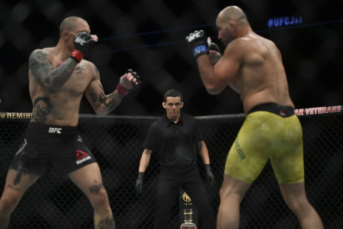 May 13, 2020; Jacksonville, Florida, USA; UFC referee Jason Herzog (center) watches Anthony Smith (red gloves) fight Glover Teixeira (blue gloves) during UFC Fight Night at VyStar Veterans Memorial Arena. Mandatory Credit: Jasen Vinlove-USA TODAY Sports