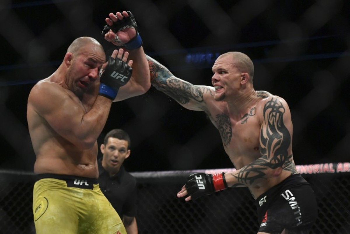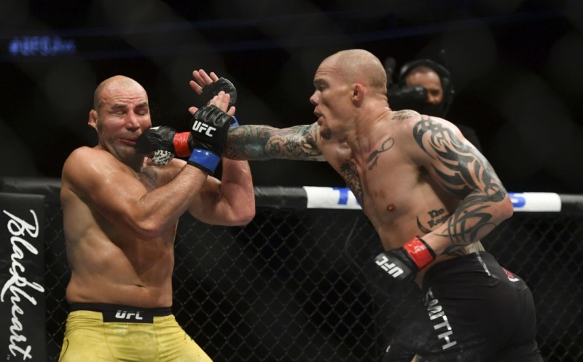 May 13, 2020; Jacksonville, Florida, USA; Anthony Smith (red gloves) fights Glover Teixeira (blue gloves) during UFC Fight Night at VyStar Veterans Memorial Arena. Mandatory Credit: Jasen Vinlove-USA TODAY SportsMay 13, 2020; Jacksonville, Florida, USA; Anthony Smith (red gloves) fights Glover Teixeira (blue gloves) during UFC Fight Night at VyStar Veterans Memorial Arena. Mandatory Credit: Jasen Vinlove-USA TODAY SportsMay 13, 2020; Jacksonville, Florida, USA; Anthony Smith (red gloves) fights Glover Teixeira (blue gloves) during UFC Fight Night at VyStar Veterans Memorial Arena. Mandatory Credit: Jasen Vinlove-USA TODAY Sports