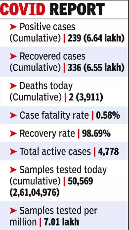 Hyderabad: A total of 239 new Covid-19 cases and two deaths were recorded on Friday. The total death toll now stands at 3,911 and the recovery rate has touched 98.69%.