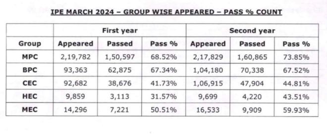 And group wise, MPC (Mathematics, Physics and Chemistry) tops the chart with 68.52% (I) and 73.85% (II). In the descending order are groups of BPC, MEC, CEC and HEC.