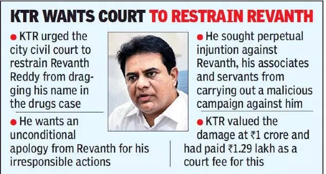 HYDERABAD: TRS working president and IT minister KT Rama Rao on Monday filed a defamation suit in the Hyderabad city civil court against TPCC president A Revanth Reddy, urging the court to restrain him from dragging his name in the ongoing ED probe in the drugs case.