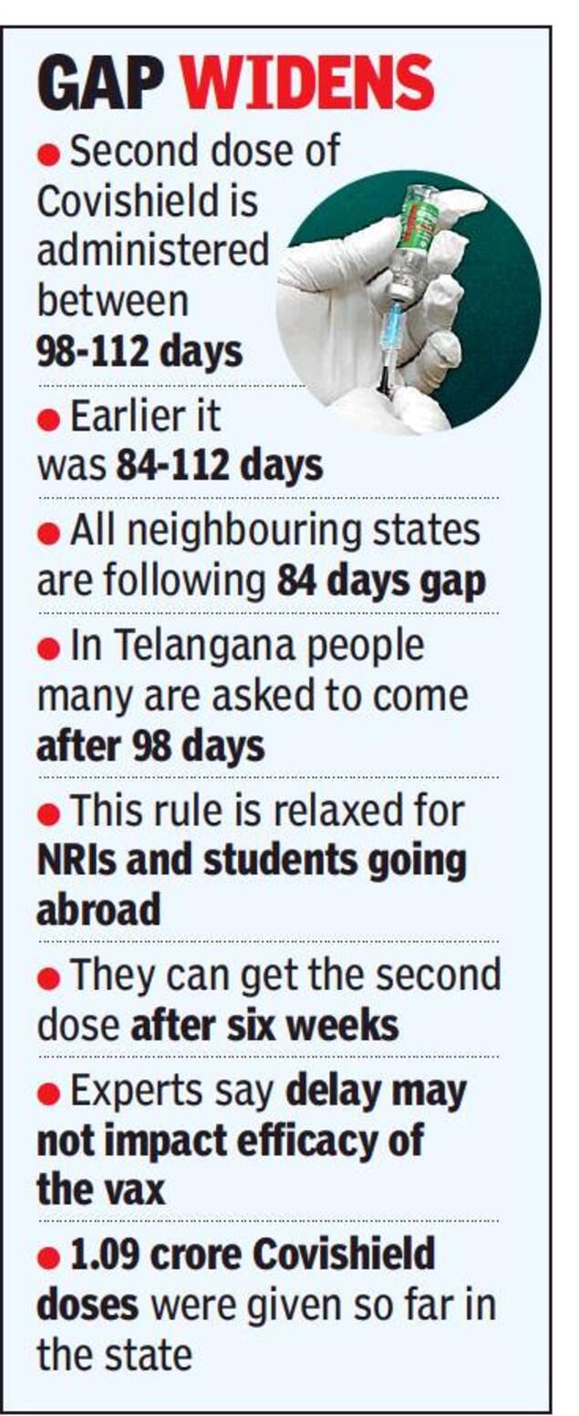 HYDERABAD: In a development that has left many vaccine beneficiaries in Hyderabad and elsewhere in Telangana surprised, health authorities have raised the gap between two Covishield shots to 98-112 days.