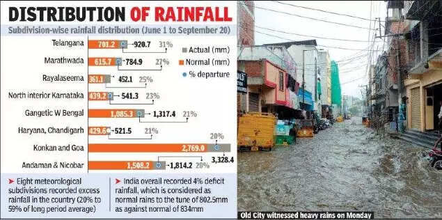 HYDERABAD: Telangana recorded 31% excess rainfall this year, the highest in the country in all sub-divisional meteorological regions. Figures by India Meteorological Department (IMD) indicate that from June 1 to September 20, the state recorded 920.7 mm of rains as against a normal of 701.2 mm.