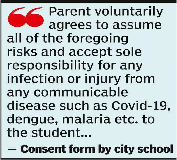 HYDERABAD: As managements gear up for physical classes from September 1, consent forms being circulated by some schools, absolving themselves from taking any responsibility for the students’ health, has irked parents.