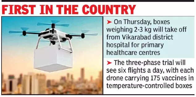 HYDERABAD/NEW DELHI: Telangana is all set to become the first state in the country to kick off a trial run for delivering vaccines by drones to healthcare centres in remote areas from Thursday.