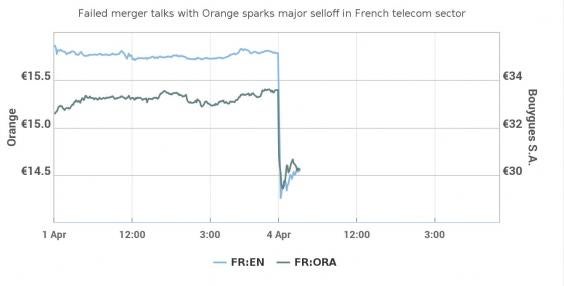 Shares in French group Bouygues slumped almost 15 per cent to €30 in early trading and were heading for their worst day in 17 years. Orange was down 5.3 per cent.