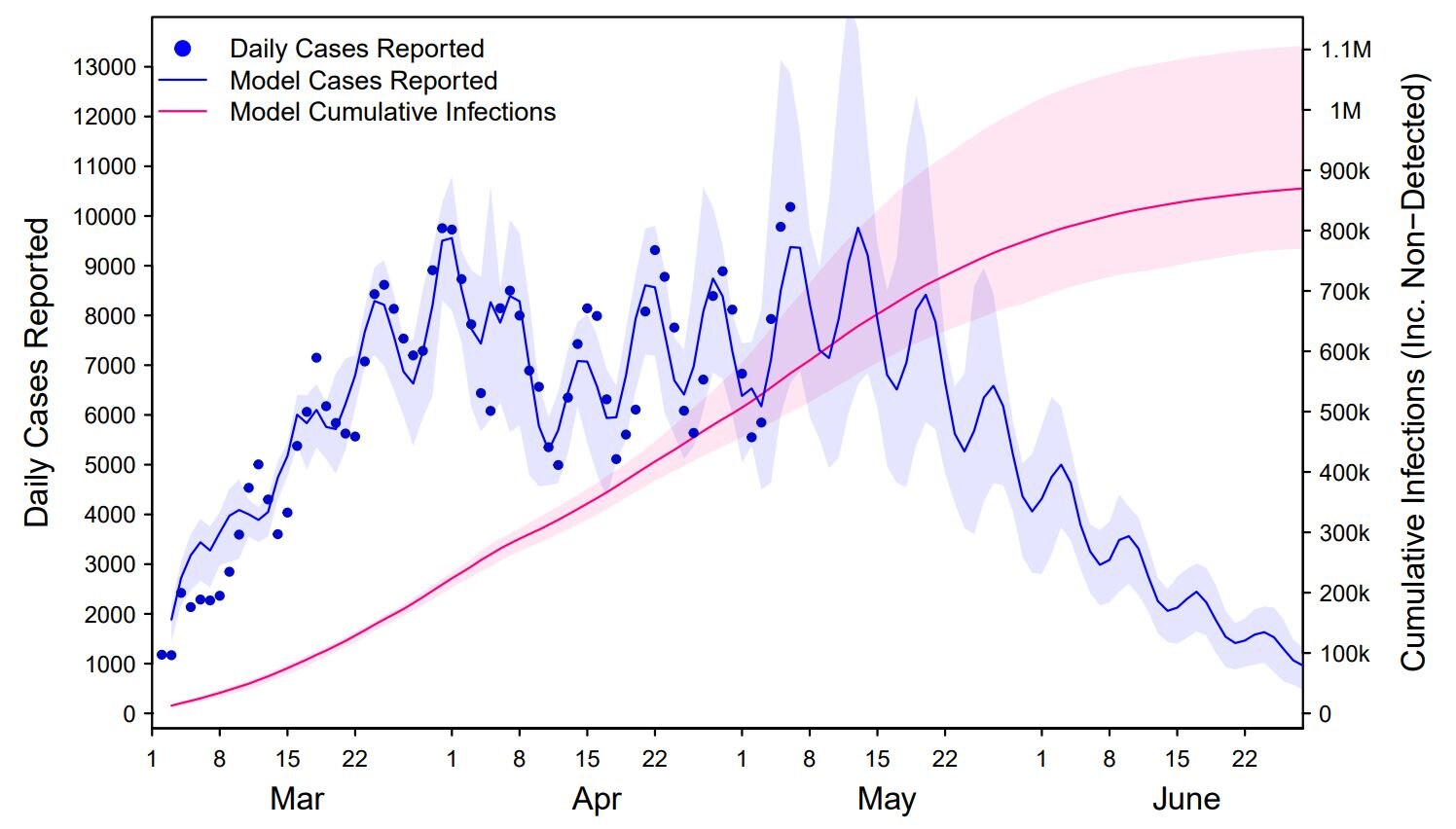 Dr Cameron said the modelling suggested daily case numbers would remain above 10,000 for the next couple of weeks before beginning to drop by the end of May and through June.