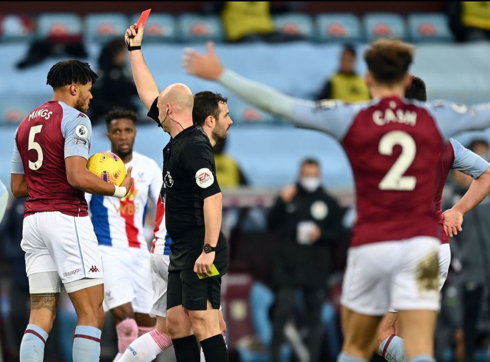 The hosts' failure to add to their lead became a more worrying issue in the 45th minute when Mings stuck out an arm to block Zaha and was shown a second yellow.