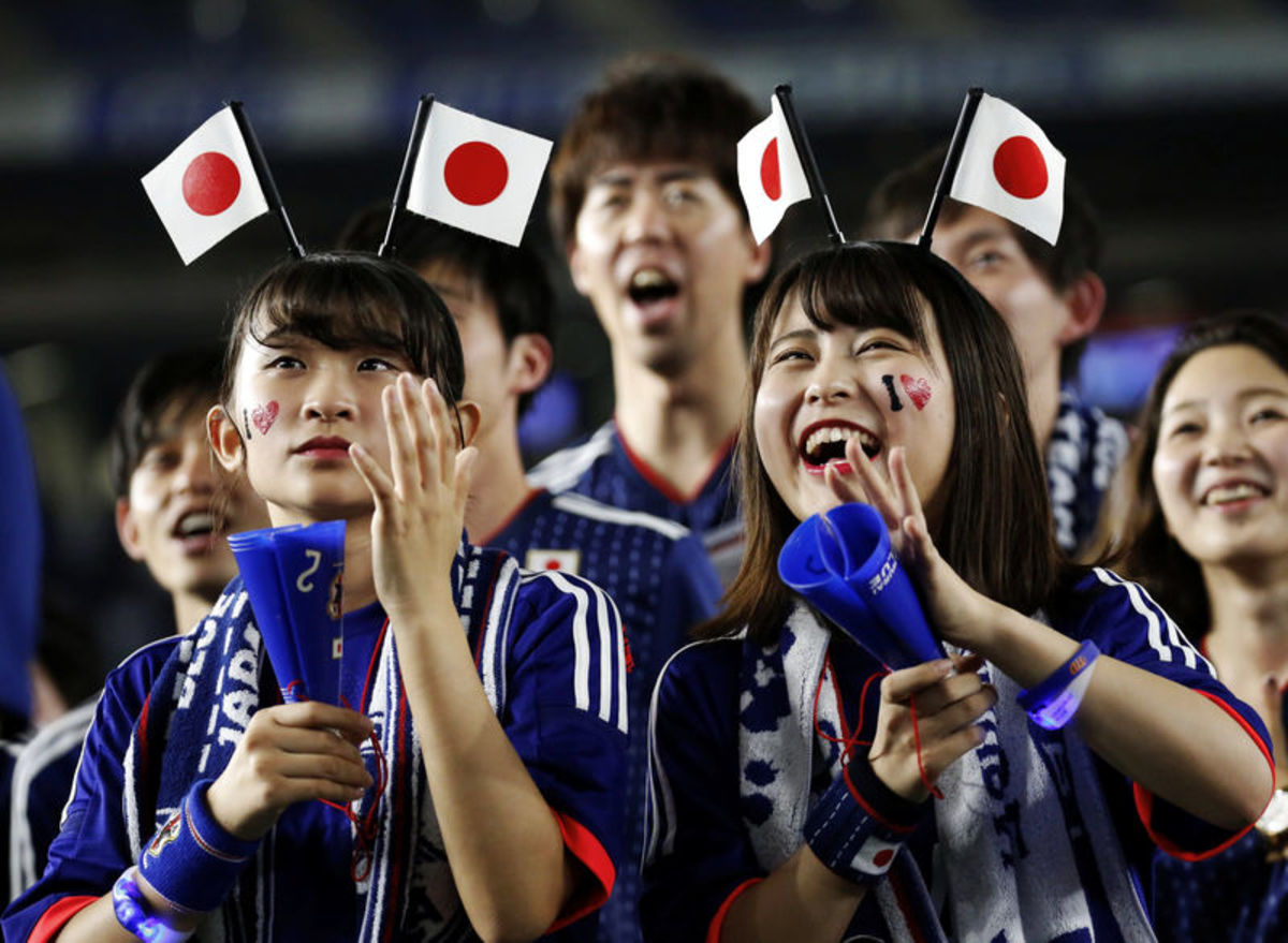 Soccer Football - World Cup - Group H - Colombia vs Japan - Mordovia Arena, Saransk, Russia - June 19, 2018 Japan fans celebrate REUTERS/Ricardo Moraes
