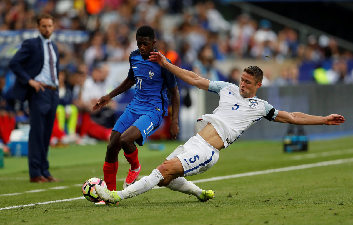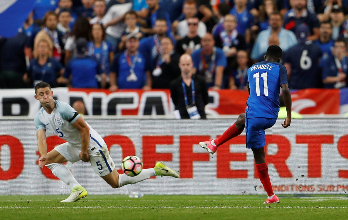 LONDON (Reuters) - Ousmane Dembele fired the winner as 10-man France beat England 3-2 in an entertaining friendly on Tuesday after Harry Kane had scored twice for the visitors and France's Raphael Varane was sent off early in the second half.