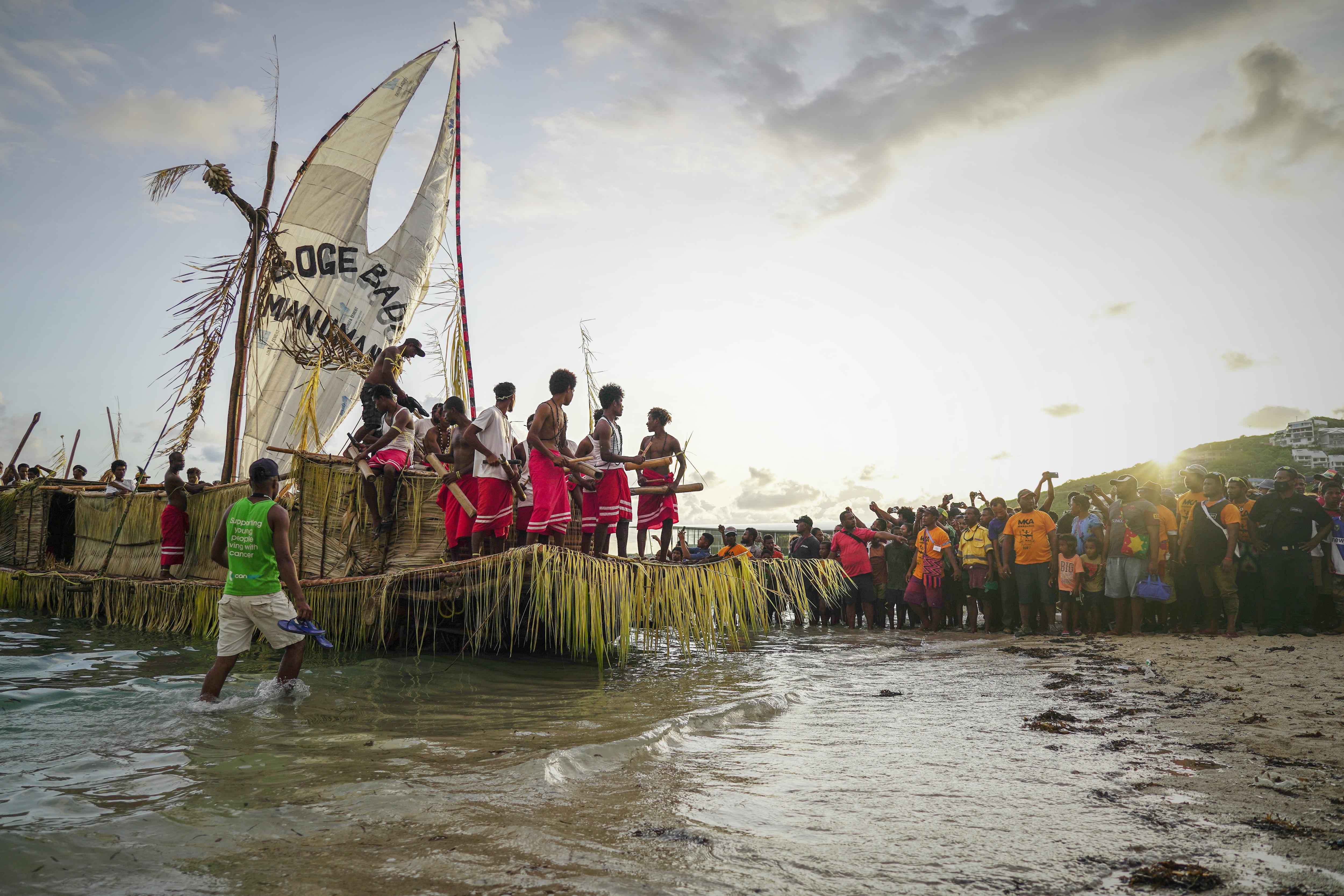 The lakatoi is welcomed ashore by singing and dancing.