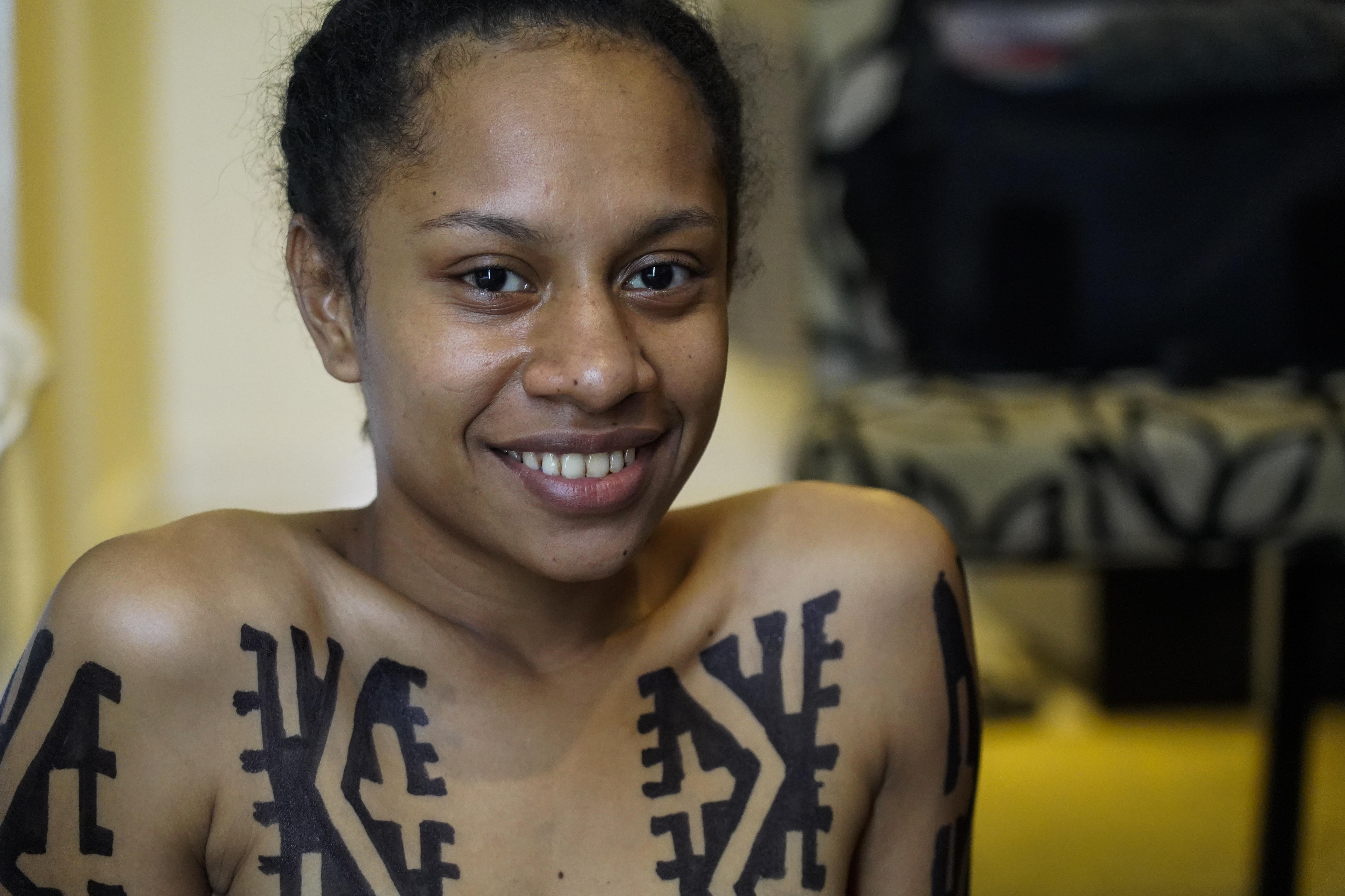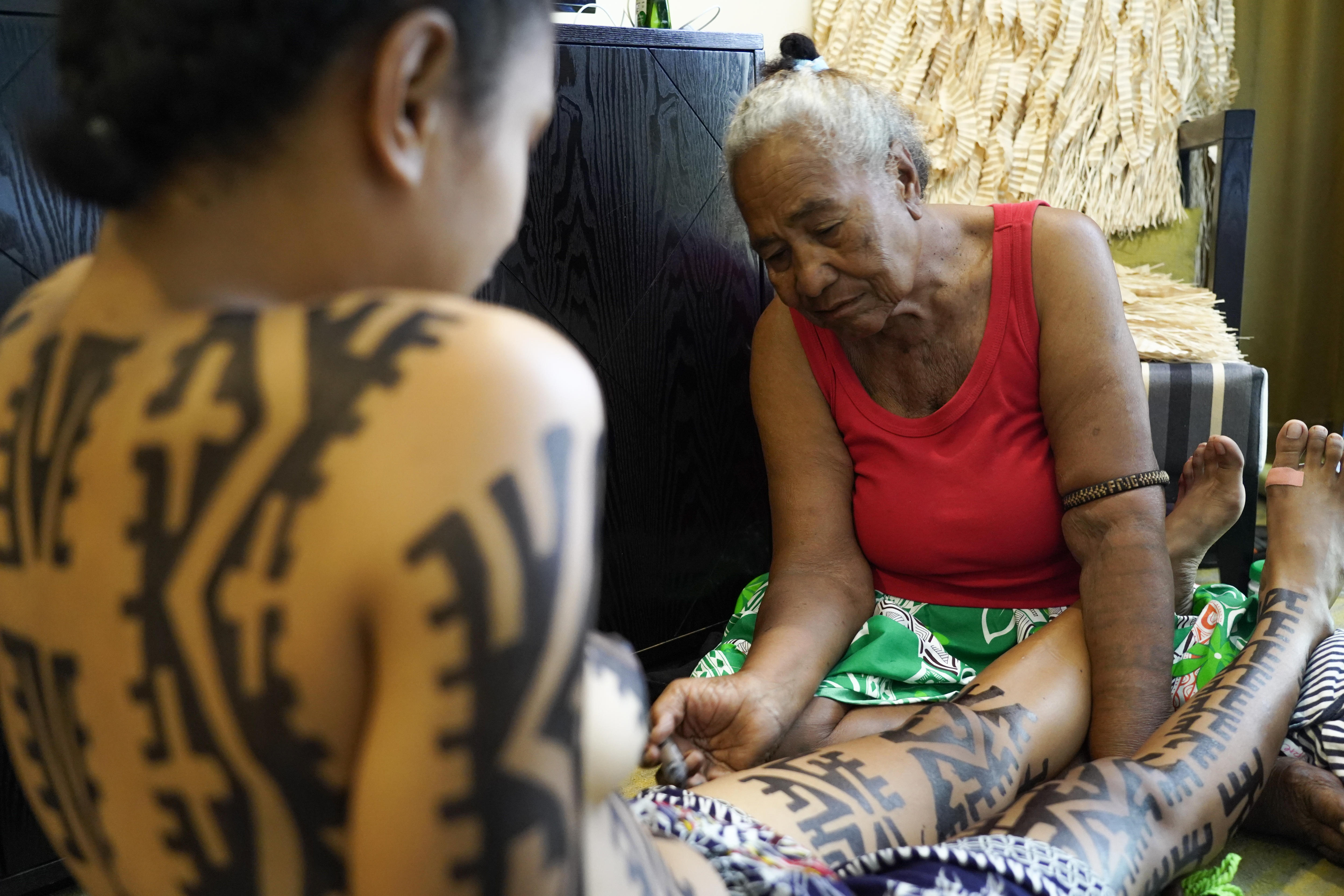 Ms Taraka is sitting on the ground of her suite with her legs outstretched while an old lady draws tattoos on her body.