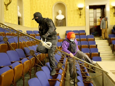 After the officers managed to escape to a lower floor of the building, Ms Eisenhart appeared to shout at them over a bannister. The mother and son duo were then seen heading into the Senate chamber.