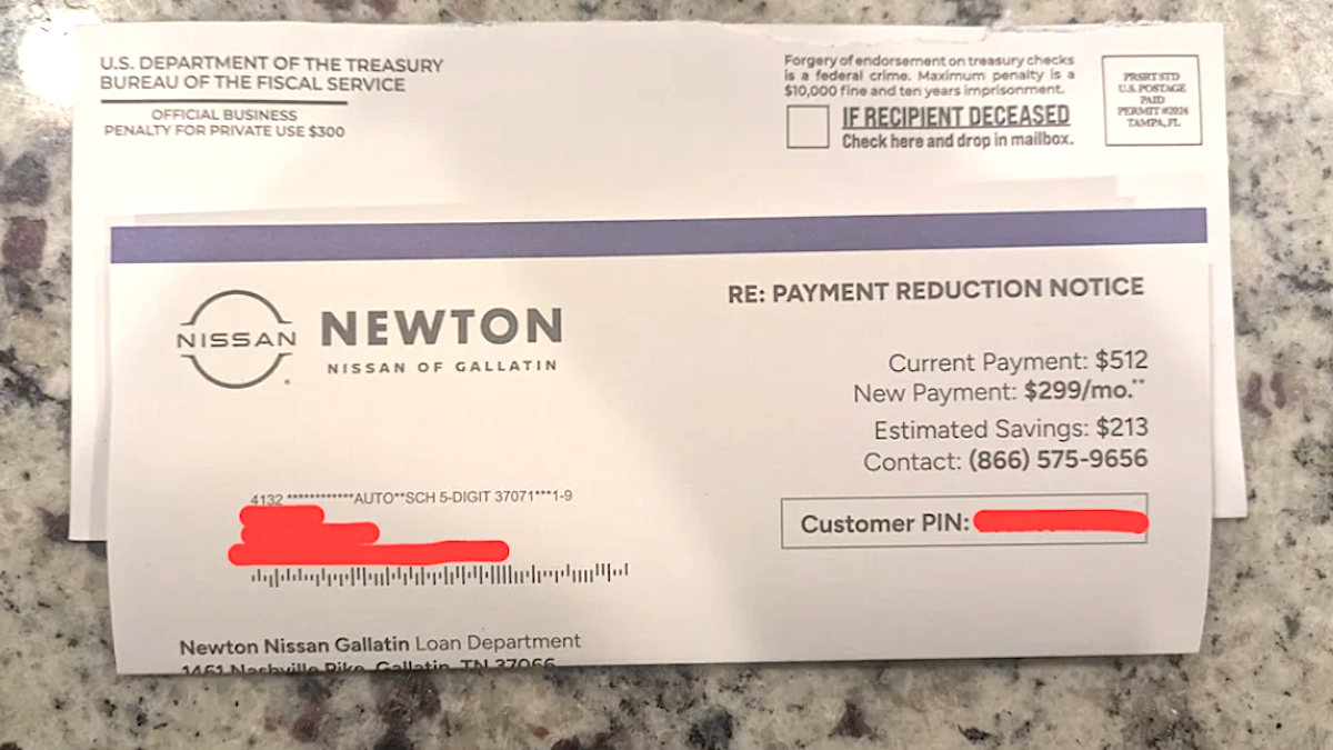 Still, several other responses — some with photos of their own — claim they, too, received mailings from Nissan Gallatin in envelopes marked “The U.S. Department of the Treasury Bureau of the Fiscal Service.”