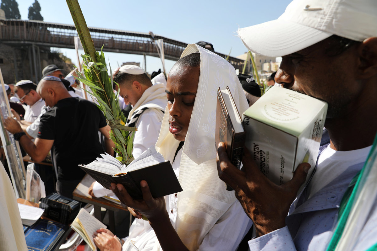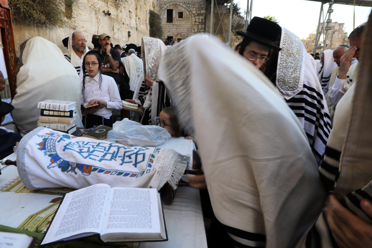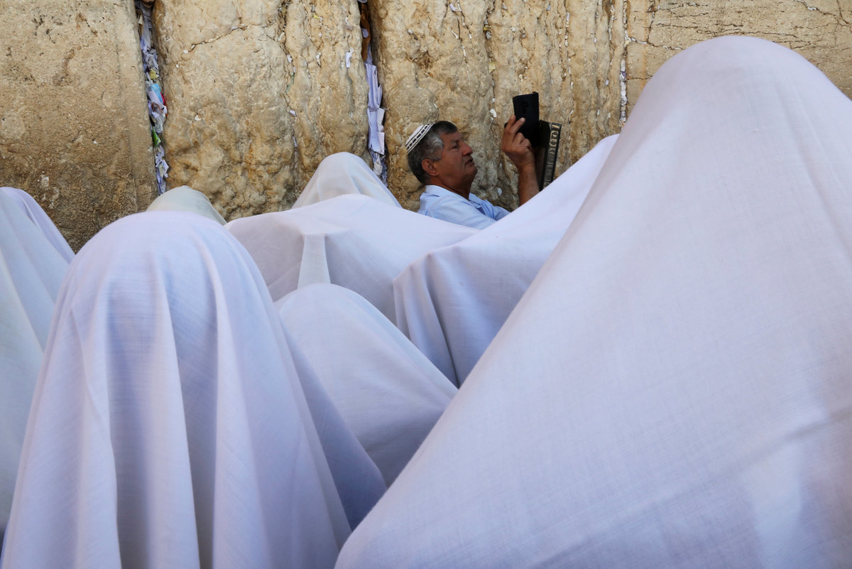 A Jewish worshipper holds up his mobile phone as others, covered in prayer shawls, take part in a priestly blessing during the Jewish holiday of Sukkot at the Western Wall in Jerusalem's Old City September 26, 2018. REUTERS/Ammar AwadJewish worshippers pray during a priestly blessing on the Jewish holiday of Sukkot at the Western Wall in Jerusalem's Old City September 26, 2018. REUTERS/Ammar AwadJewish worshippers, some covered in prayer shawls, pray during a priestly blessing on the Jewish holiday of Sukkot at the Western Wall in Jerusalem's Old City September 26, 2018. REUTERS/Ammar AwadA Jewish worshipper, covered in a prayer shawl, prays next to a covered torah scroll during a priestly blessing on the Jewish holiday of Sukkot at the Western Wall in Jerusalem's Old City September 26, 2018. REUTERS/Ammar AwadA Jewish worshipper holds the Four Species, used in rituals for the holiday of Sukkot, as he prays during a priestly blessing at the Western Wall in Jerusalem's Old City September 26, 2018. REUTERS/Ammar AwadA Jewish worshipper holds the Four Species, used in rituals for the holiday of Sukkot, as he prays during a priestly blessing at the Western Wall in Jerusalem's Old City September 26, 2018. REUTERS/Ammar AwadUltra-Orthodox Jewish boys watch as worshippers holding the Four Species, used in rituals for the holiday of Sukkot, pray during a priestly blessing at the Western Wall in Jerusalem's Old City September 26, 2018. REUTERS/Ammar AwadA general view shows thousands of Jewish worshippers attending the priestly blessing on the Jewish holiday of Sukkot at the Western Wall in Jerusalem's Old City September 26, 2018. REUTERS/Ammar Awad