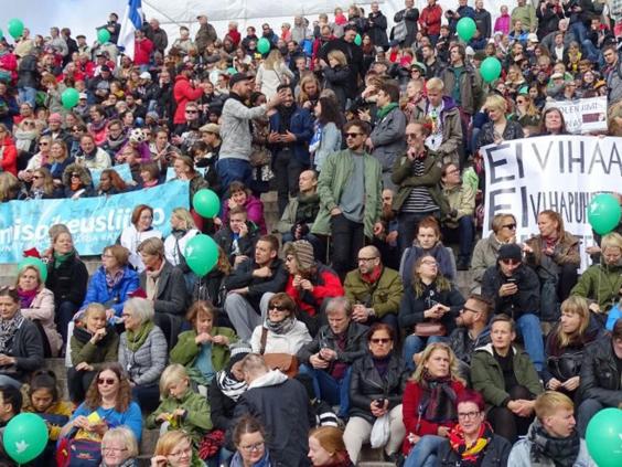 The demonstration snaked through the capital of Helsinki as participants and spectators held green balloons and signs reading "No to Nazism".