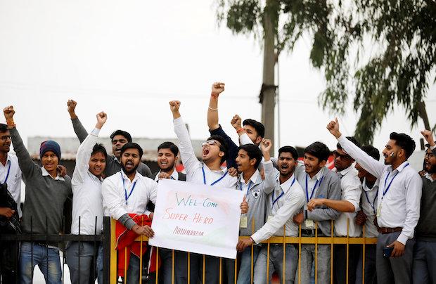 On the Indian side of the border, Indian policemen were lined up along the road as a group of cheering residents from the area waved India’s national flag and held up a huge garland of flowers to welcome him back.