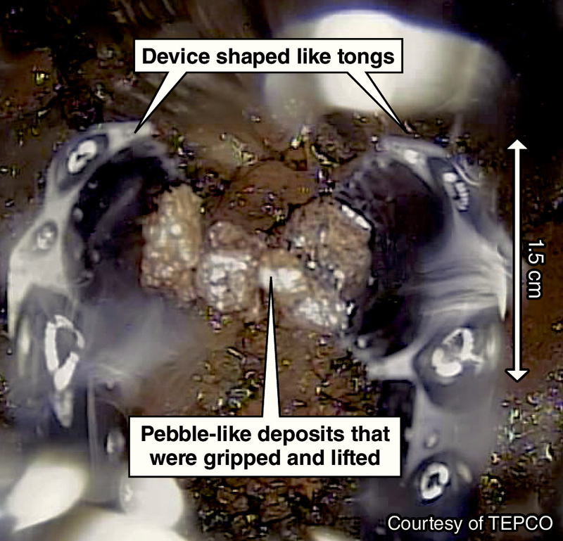 According to TEPCO, the device was attached to one end of an extendable pipe and guided through another pipe into the containment vessel, before being lowered to the bottom using a retractable cable. The device made contact with pebble-like deposits at six places and, using the grips, was able to grab, lift and move parts of the deposits in five places. In one location, the deposit had solidified and could not be moved.