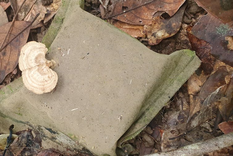 Our method involved placing a series of mesh-covered wood blocks on the soil surface in a few locations. Half the blocks had small holes in the mesh, giving termites access. The other half didn’t have such holes, so only microbes could access the blocks through the mesh.