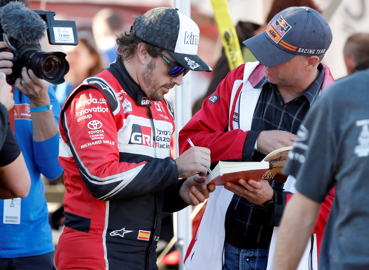 Rallying - Dakar Rally - Stage 2 - Al Wajh - Neom, Saudi Arabia - January 6, 2020 Toyota Gazoo Racing's Fernando Alonso signs his autograph for a fan after completing stage two REUTERS/Hamad I Mohammed