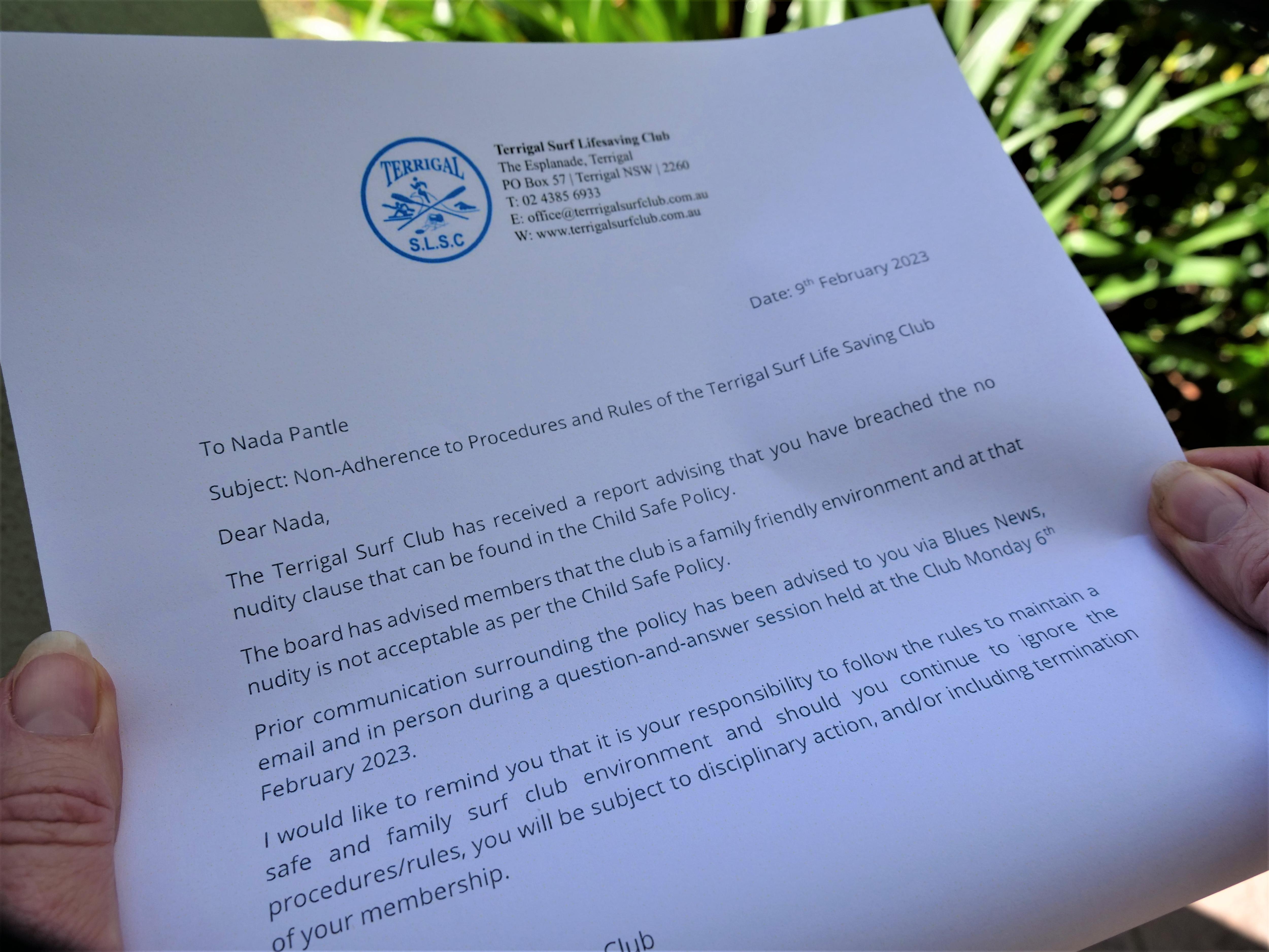 But she recently received a warning letter from the club claiming she had breached the club's nudity in change rooms policy.