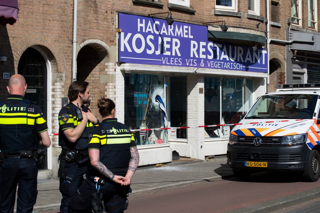 A man who allegedly vandalized a kosher restaurant in Amsterdam last year, smashing a window and ramming an Israeli flag through the hole, acted with terrorist intent, prosecutors alleged Wednesday.