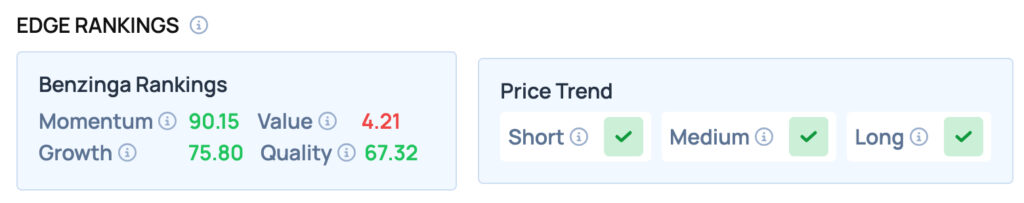Tesla scores well on Momentum, Growth and Quality metrics, but offers poor Value. Tesla also offers a favorable price trend in the Short, Medium and Long term. For more such insights, sign up for Benzinga Edge Stock Rankings today!
