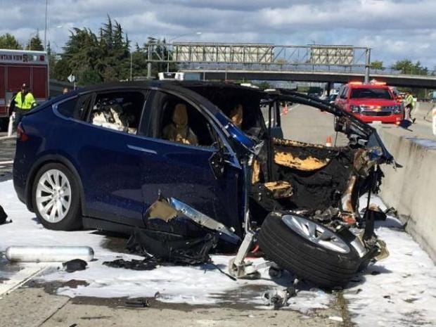 Tesla said its vehicle logs show the driver took no action to stop the Model X SUV from crashing into a concrete lane divider. Photographs of the car show that the front of the vehicle was demolished, its roof was ripped off and its front wheels were scattered on the road.