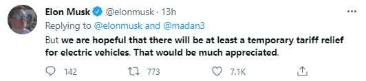 He, however, said, "We are hopeful that there will be at least a temporary tariff relief for electric vehicles. That would be much appreciated."