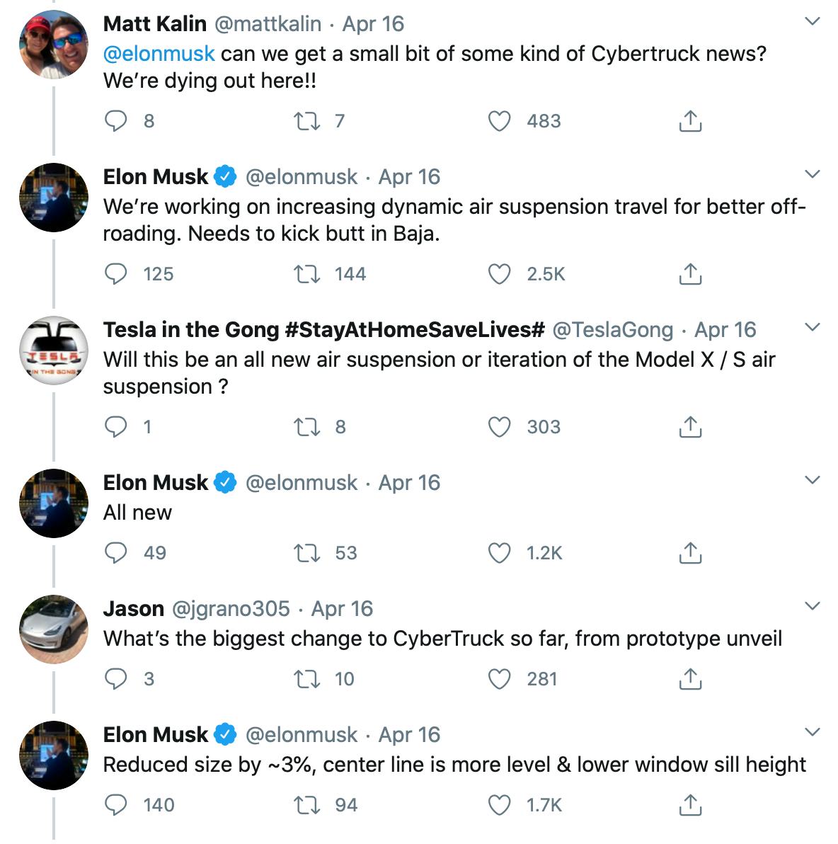 Reduced size by ~3% [when compared to the November prototype], center line is more level & lower window sill height [...] We’re working on increasing dynamic air suspension travel for better off-roading. Needs to kick butt in Baja.
