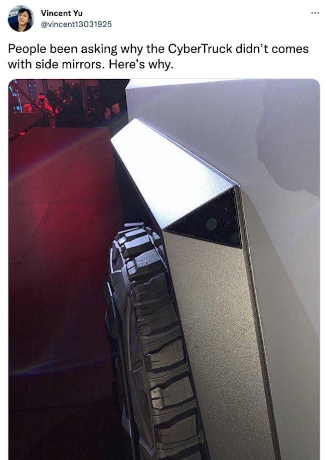 Vincent Yu, founder of website Tesmanian, suggested on Twitter in December 2019 that the truck would use cameras located above the wheel instead of side mirrors: