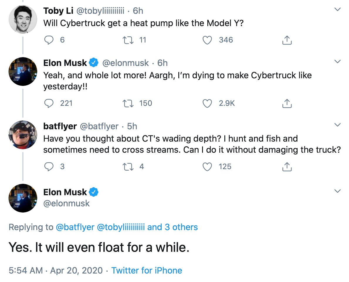 In response to questions from Twitter users "batflyer" and "tobyliiiiiiiiii," Musk confirmed that the truck would be able to cross water streams without damaging the truck, writing that it would even "float for a while." Musk also confirmed that the truck would offer the same heat pump as seen on the Model Y compact SUV that started rolling out last month, a key feature for saving electricity.