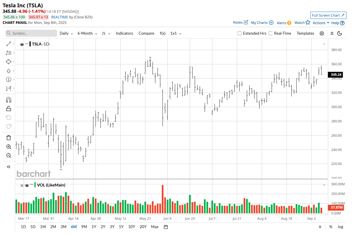 Shares of TSLA have traded in a volatile 52-week range between $210.51 and $488.54. The stock is up more than 60% over the past year, outperforming the S&P 500 Index ($SPX), though still below its all-time highs. Recent momentum reflects investor optimism surrounding autonomy, with the Robotaxi launch adding fuel to Tesla’s AI narrative.