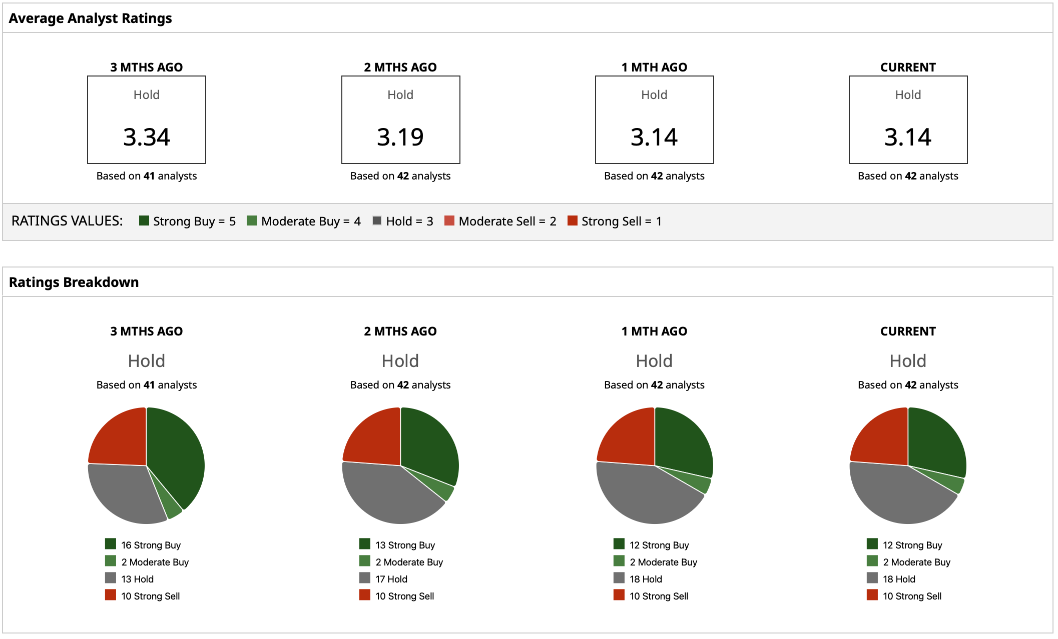 Tesla has a “Hold” rating consensus, and a mean price target is a lofty $299.28, representing a potential downside of around 15% from here. The highest price target is a steep $500, premised on Tesla following through on its AI vision, while the weakest price target is a meager $115, citing valuation and execution risk concerns.