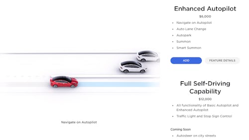 Enhanced Autopilot — a term Tesla has used in the past, by the way — includes every Full Self-Driving feature except for the ability to auto-stop at stop signs and traffic lights (h/t Electrek). If drivers do want that particular beta feature, the Full Self-Driving package is still available for $12,000 during checkout. Enhanced Autopilot, meanwhile, rings up at $6,000.