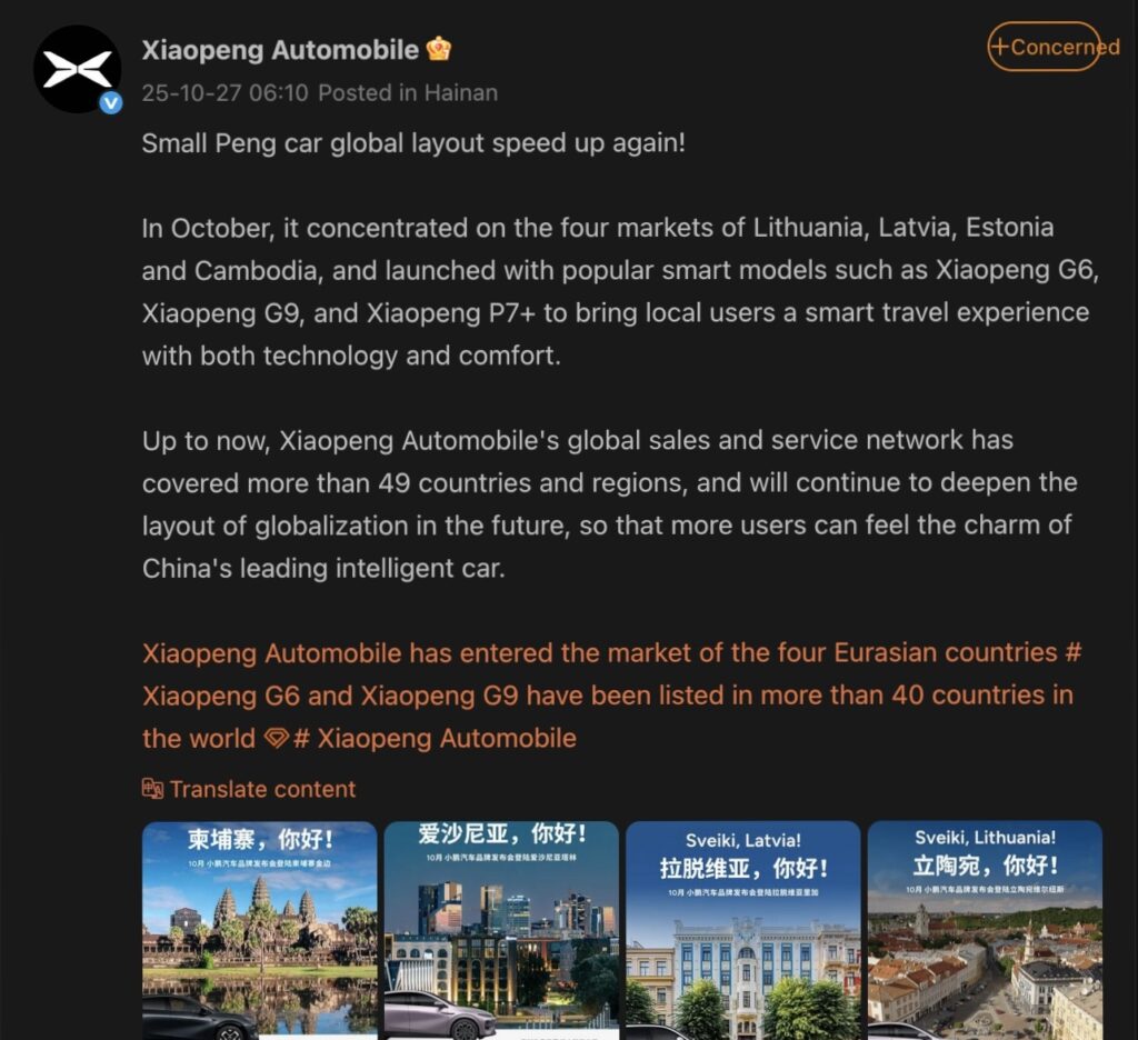 Announcing the expansion into Europe via a post on the Chinese X counterpart Weibo, the company said it was entering three new countries in the European market: Estonia, Lithuania and Latvia, as well as Cambodia in the Asian market. "Up to now, Xiaopeng Automobile’s global sales and service network has covered more than 49 countries and regions," the company said in the post.