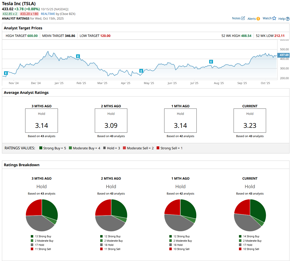 Out of the 43 analysts covering TSLA stock, 14 recommend “Strong Buy,” two recommend “Moderate Buy,” 17 recommend “Hold,” and 10 recommend “Strong Sell.” The average TSLA stock price target is $345, below the current trading price of $433.