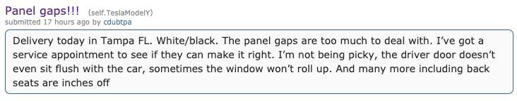 Reddit communities that have previously showered praise on Tesla's electric vehicles are now full of reports of nervous Model Y buyers who are waiting to see if their $50,000+ purchases are going to arrive with any of the widely reported problems, including problems with the exterior paint, misaligned doors, dirty interiors, and in some instances, loose rear seats.