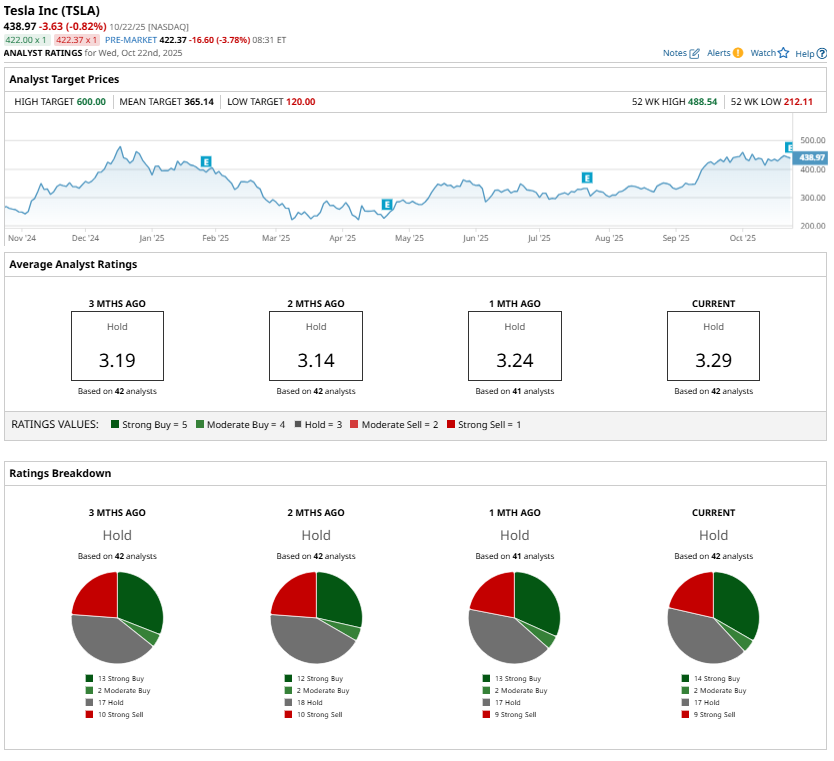 Tesla’s high valuation reflects not just its current business but also the expectation that it will dominate future technologies, including EVs, energy storage, AI, robotaxis, and robotics. Thus, analysts are sidelined on TSLA stock and maintain a “Hold” consensus rating.