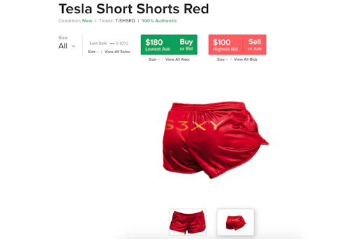 Is Tesla the new Supreme? Okay, no, that's a stretch beyond imagination. But, the world's most valuable automaker did take a page out of the streetwear brand's book with its latest hot product: the "S3XY" short shorts it dropped over the weekend, which apparently were so limited that you'll have to pay resale prices if you want a pair because they're all sold out. Featuring a red satin and gold trim design with "S3XY" lettering across the back — perhaps paying homage to the "JUICY" shorts that are iconic in thot circles — Tesla's shorts were originally priced at $69.420 (thank Elon Musk for being so clever). Now that they're out of stock on its online shop, though, they're going for up to $475 on resale apps such as StockX, or lower depending on the size you want.