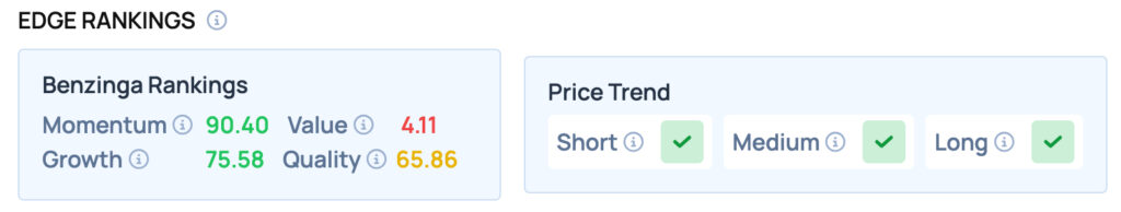 Tesla scores well on Momentum and Growth metrics, while boasting satisfactory Quality, but poor Value. Tesla also offers a favorable price trend in the Short, Medium and Long term. For more such insights, sign up for Benzinga Edge Stock Rankings today!